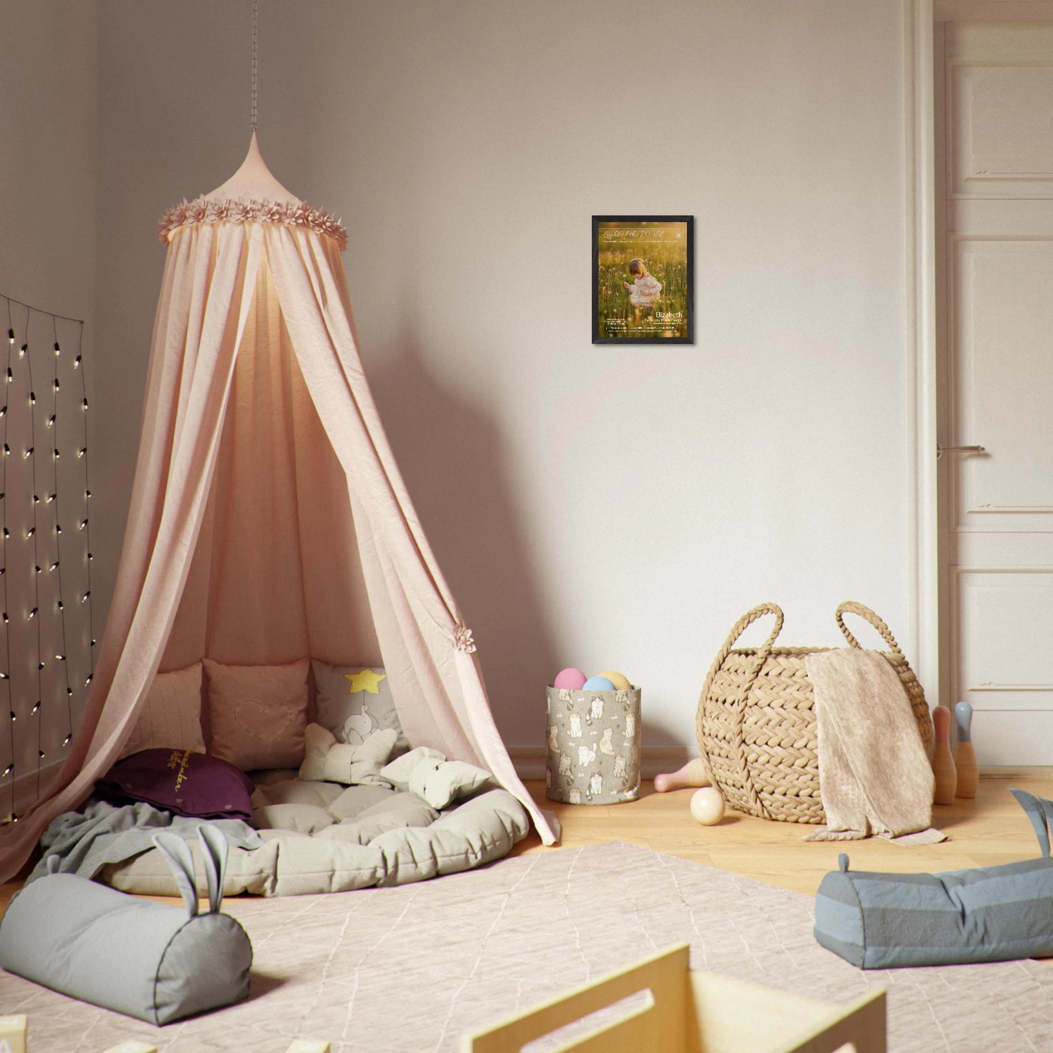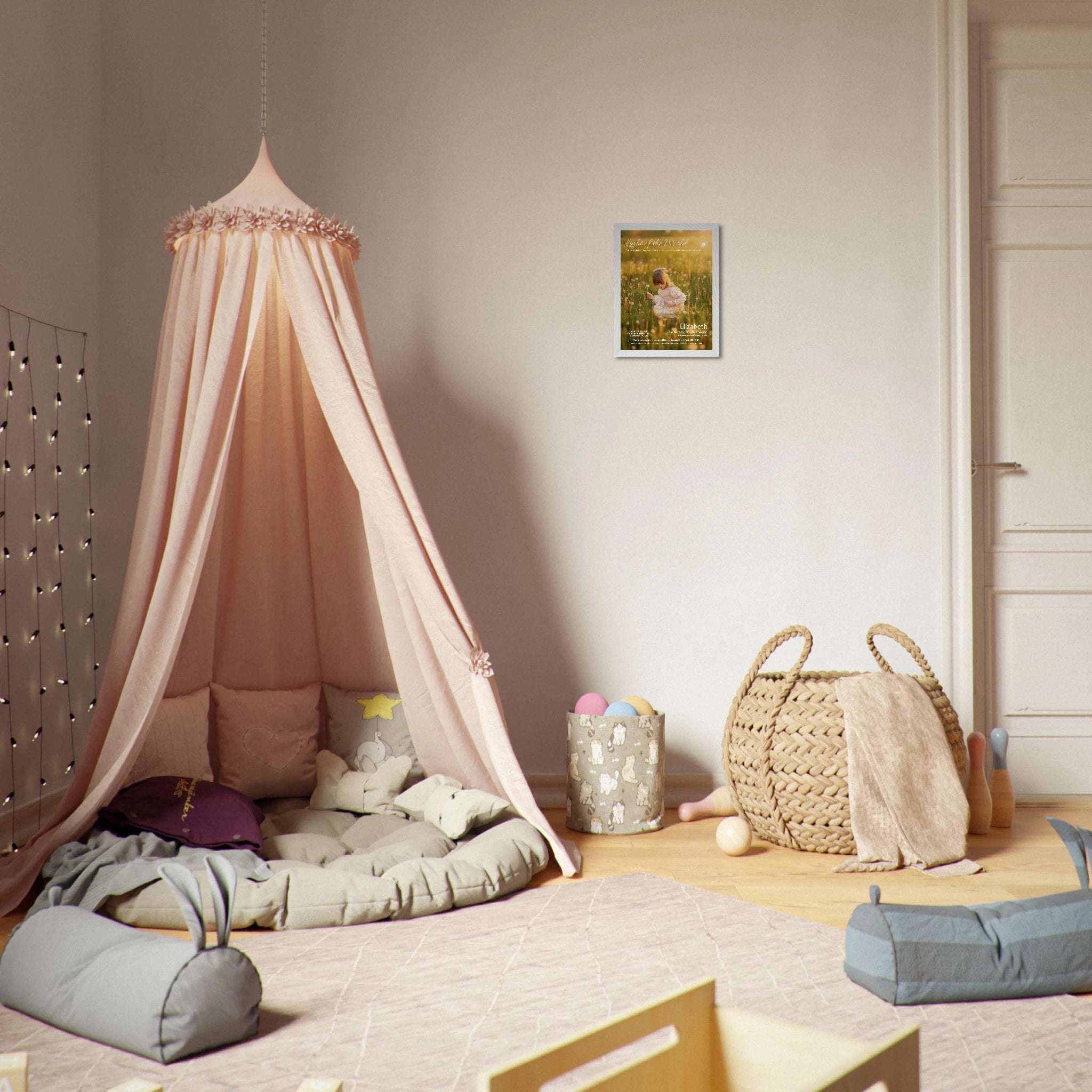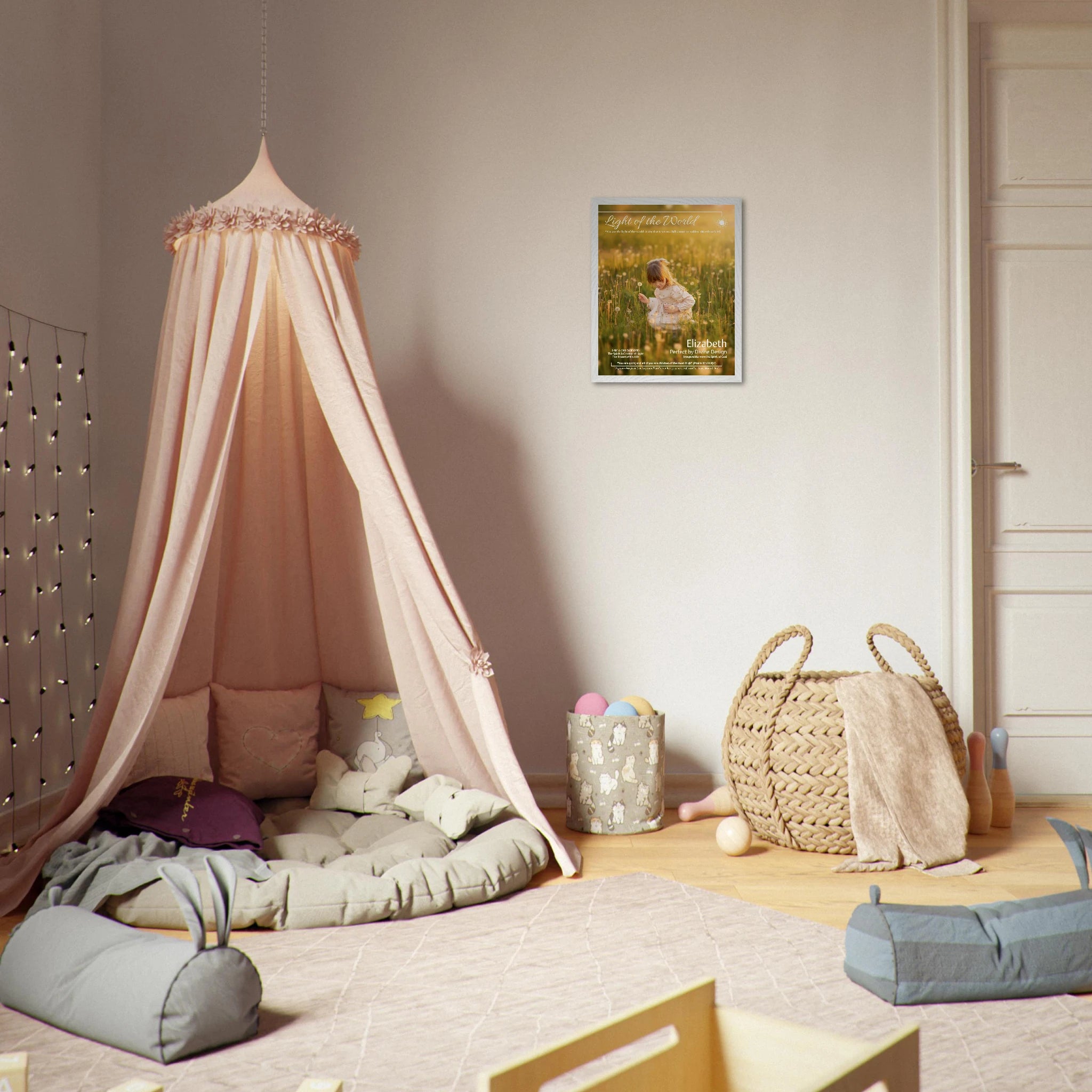 Words shape worldview—especially in childhood. This faith-forward statement piece centers the beloved scripture “You are the light of the world…” (Matthew 5:14) and blends portrait photography with a message of strength and calling. Create a visual anchor for bedtime routines, morning affirmations, or family prayer time—so the message of light is always within view.