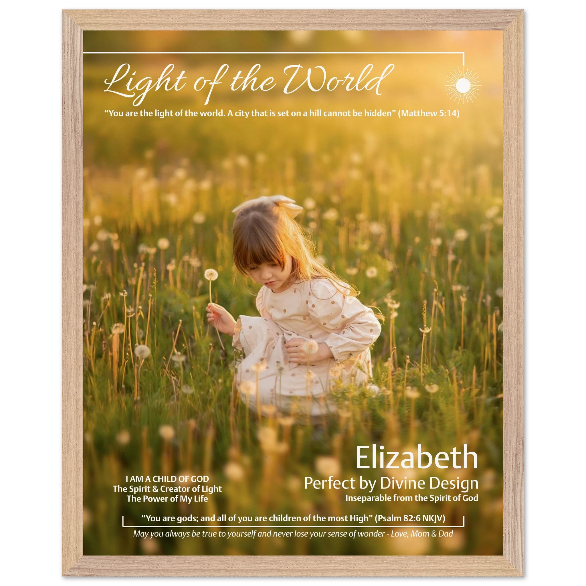 Speak life over your child. Personalize this “Light of the World” portrait with their name, photo, and Matthew 5:14 (or chose your own) for a daily reminder of identity, purpose, and God’s light. Framed and ready to hang.
