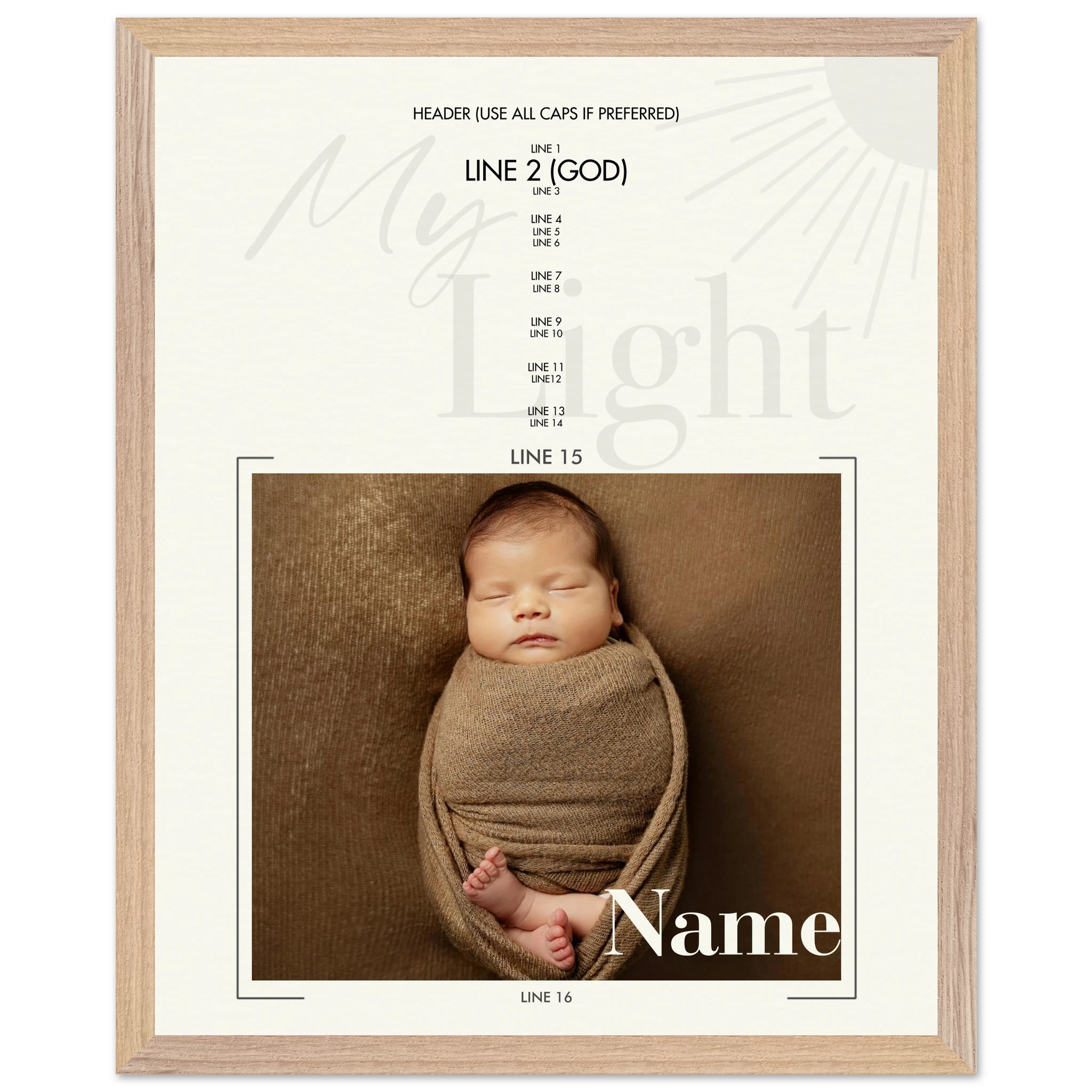 Artful reminder of your link to God’s light. Personalize the Light Lineage Portrait with your own “lineage of light” text and color choices to create a daily visual of identity, purpose, and divine connection—beautifully framed and ready to hang.